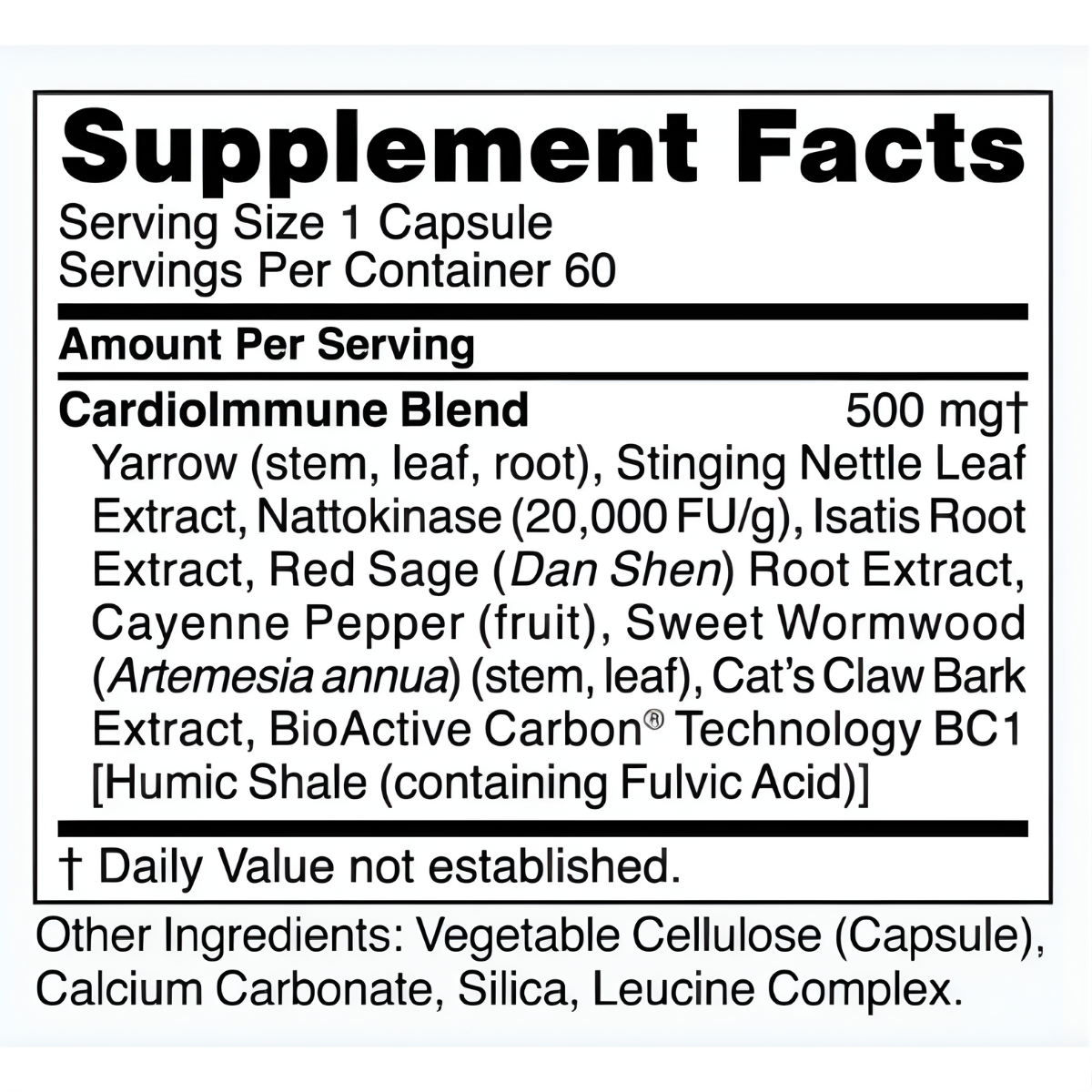 CardioImmune includes nattokinase, yarrow root, stinging nettle leaf, Isatis root extract, Danshen root, cayenne pepper fruit, wormwood, and cat’s claw bark extract.