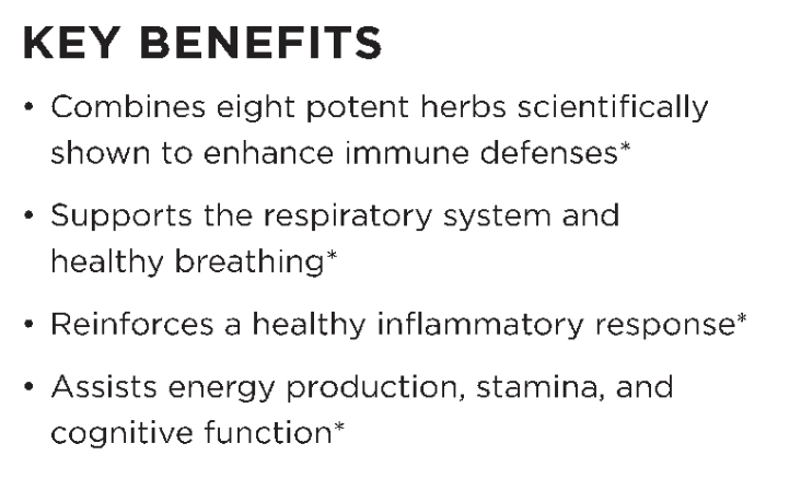 This cutting-edge formula features eight herbs that work synergistically to support an effective immune system and inflammatory response, as well as the respiratory system and healthy breathing in the face of modern-day health challenges.* It also aids energy