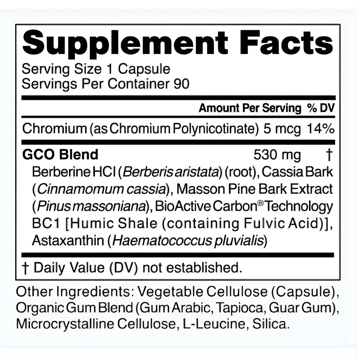 GCO is formulated with nutrients and herbs including astaxanthin, berberine HCL, cassia bark, and Masson pine bark to support existing healthy blood sugar levels, metabolism, cardiovascular health, and digestive function.*The addition of Carbon Technology supports cellular renewal, repair, and energy production, as well as healthy mitochondrial function.*