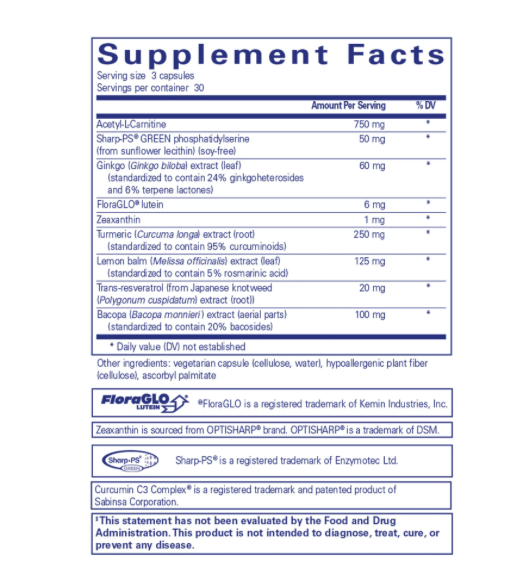 This formula combines acetyl-l-carnitine, phospholipids and herbal extracts to promote neural health, cognitive function and memory. Acetyl-l-carnitine serves as an acetyl donor to support healthy levels of acetylcholine, a key neurotransmitter in the brain. Phosphatidylserine is an important cell membrane component critical for neuron function and communication. Research suggests that it promotes healthy neurotransmitter levels and spatial memory. The Ayurvedic herb Bacopa monniera promotes memory as well as mental function and information processing. Ginkgo biloba promotes cerebral blood flow, vascular integrity and healthy red blood cell and platelet function in the brain. Lutein and zeaxanthin are the primary carotenoids in the macula, but have also recently been identified as the primary carotenoids in the brain. Research studies have found a positive association between lutein and zeaxanthin intake, macular pigment density and cognitive function. This association is believed to be due to antioxidant defense and cytokine balance properties, helping to promote neuronal membrane stability and function. Curcumin, resveratrol and lemon balm extracts help to protect neurons from oxidative stress. Additionally, curcuminoids and resveratrol support healthy vascular tissue in the brain by enhancing phagocytosis and proteosome activity. The soothing properties of lemon balm are highlighted in one double blind, randomized, placebo-controlled trial, indicating that it promoted relaxation and cognitive function in elderly individuals.