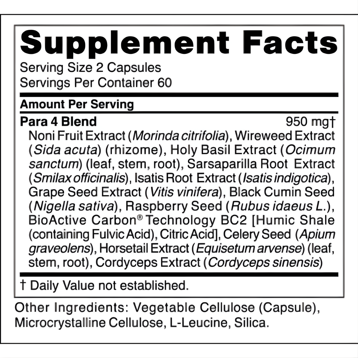 Para 4 is a blend of 11 potent herbs known for supporting digestion, detoxification, and immunity including extracts of celery seed, cordyceps sporocarp, holy basil stem and leaf, horse tail, noni root and stem, and sarsaparilla root*