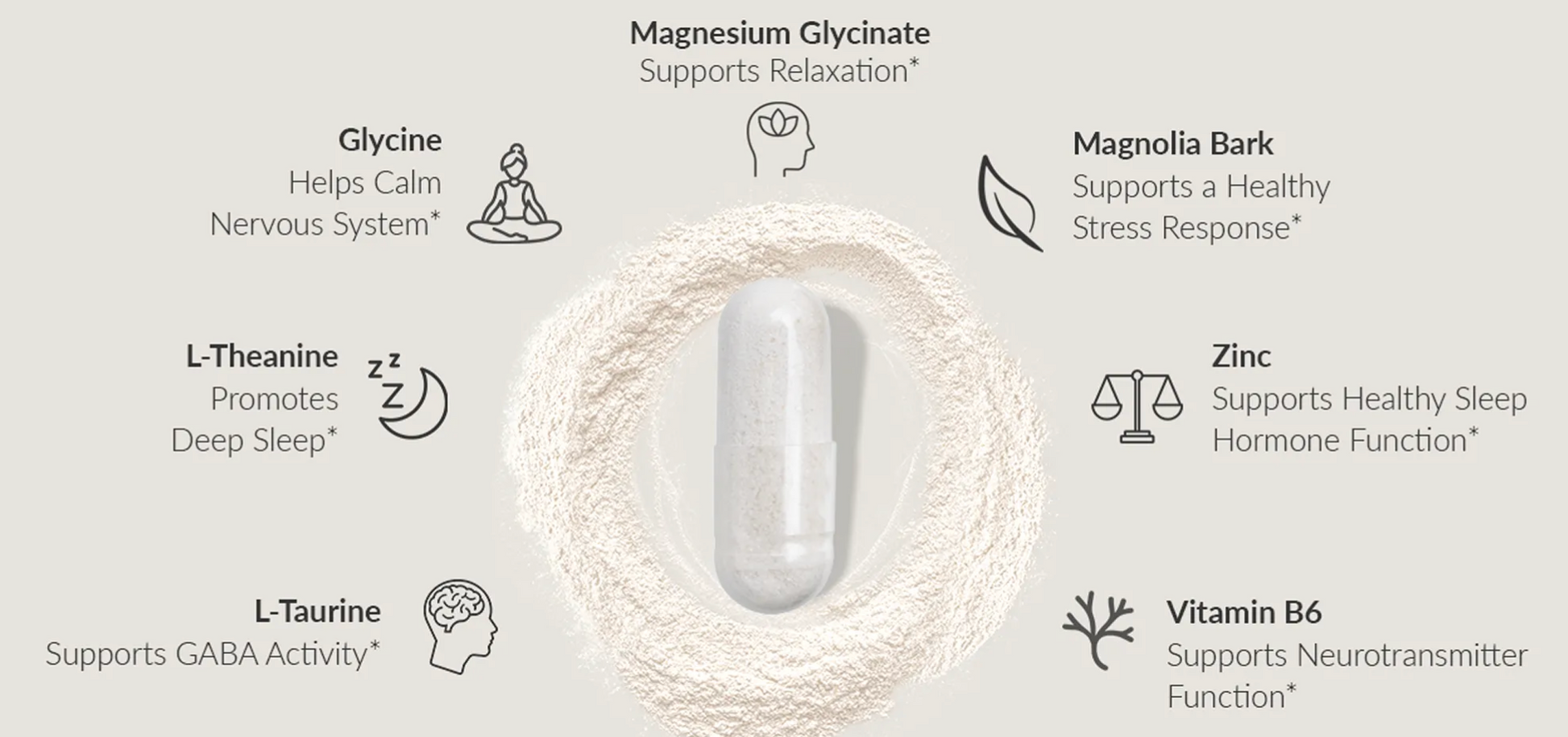 A melatonin-free formula that helps you wind down, sleep deeply, and feel refreshed the next day…so you don’t need to rely on podcasts, white noise machines, or your last ounce of patience.*